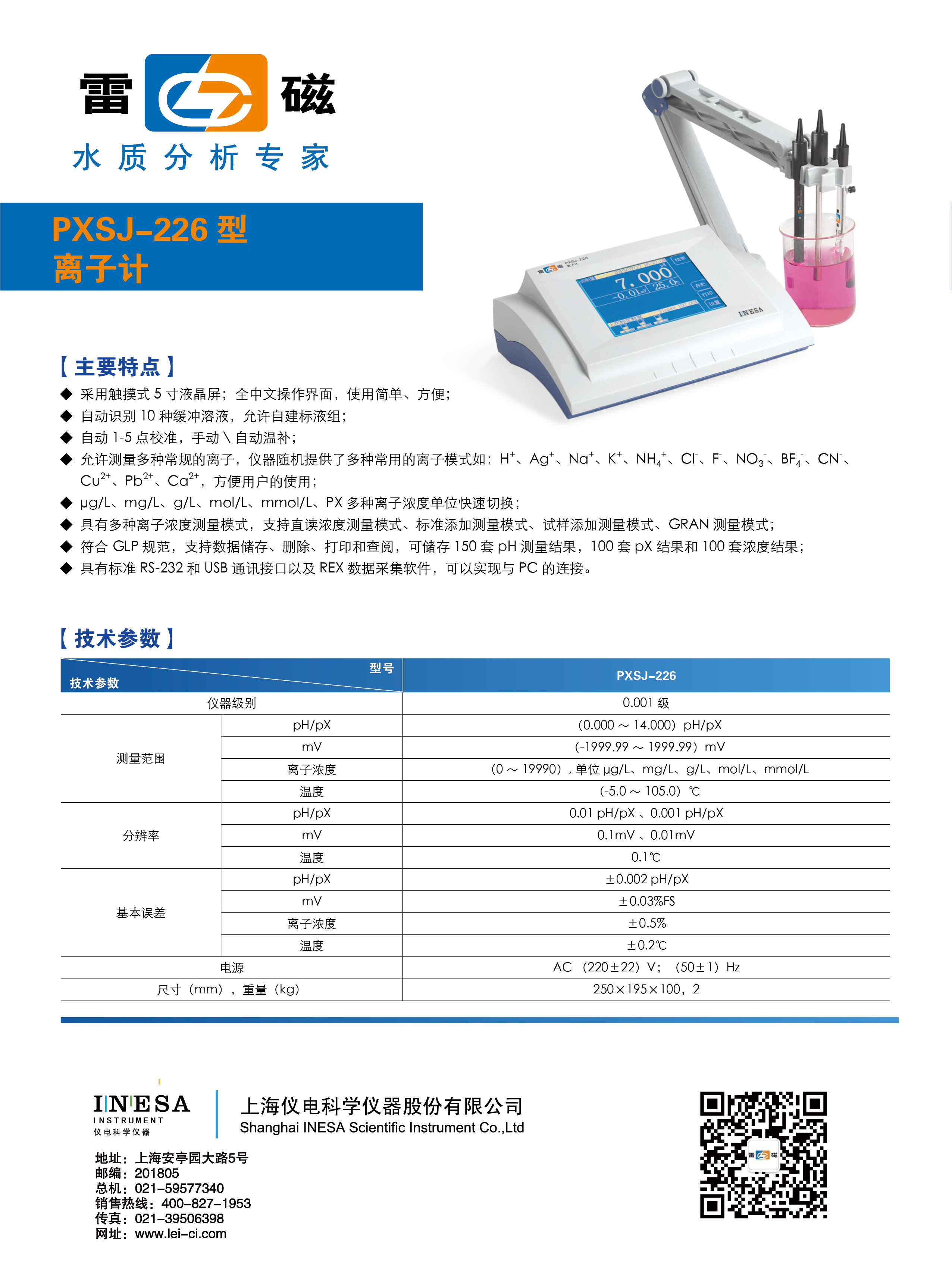 PXSJ-226型離子計(jì)是一種用于測定溶液中離子濃度的實(shí)驗(yàn)室電化學(xué)分析儀器,是精密級的離子測量儀器,其測定方式類似于常見的pH計(jì),即以各種離子選擇電極為指示電極,再輔以適當(dāng)?shù)膮⒈入姌O一起插入待測溶液中構(gòu)成供測定用的電化學(xué)系統(tǒng)。...