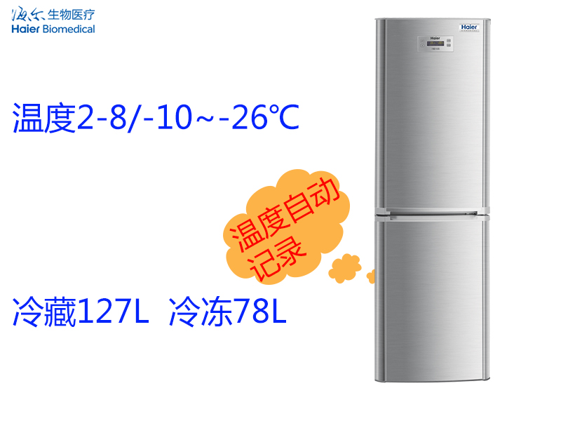 海爾藏冷凍保存箱HYCD-205,冷藏2~8℃ ,冷凍-10~-26℃;冷藏127L冷凍78L;冷藏室超大容量;冷凍室雙密封,保溫好; 內膽全不銹鋼;冷藏冷凍雙顯,冷藏室、冷凍室溫度顯示,一目了然;溫度自動記錄,自動存儲,帶U盤即插即用;高低溫、傳感器故障、斷...